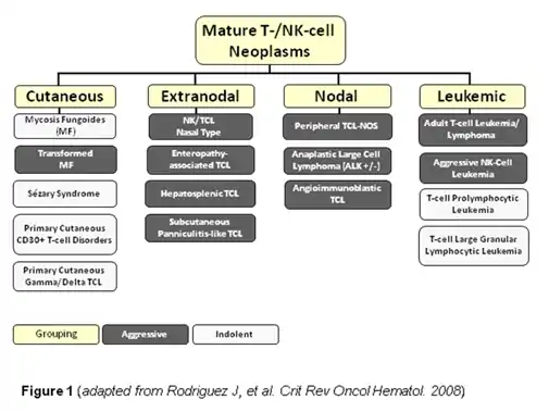 Peripheral T-cell lymphoma not otherwise specified (PTCL-NOS), is a subtype of peripheral T-cell lymphoma. Peripheral T-cell lymphoma (PTCL) is defined as a diverse group of aggressive lymphomas that develop from mature-stage white blood cells called T-cells and natural killer cells (NK cells) (see figure for an overview of PTCL subtypes). PTCL is a type of non-Hodgkin's lymphoma (NHL).[2] PTCL specifically affects T-cells rather than B-cells, and results when T-cells develop and grow abnormally.