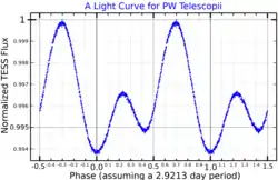 PW Tel was first noticed to vary in brightness in observations taken in 1978 by Pierre Renson.[20] The star was confirmed to be variable and was given the variable star designation PW Telescopii in 1981. Further observations by Jean Manfroid in 1985 improved earlier data, including the star's period.[21] PW Tel is an α2 CVn variable[6] that has an amplitude of 0.011 magnitudes within the visual passband and a period of 2.92 days.[22]