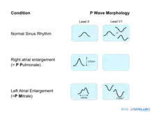 Peaked P waves (> 0.25 mV) suggest right atrial enlargement, cor pulmonale, (P pulmonale rhythm),[1] but have a low predictive value (~20%).[2]