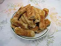 Paçanga böreği is a type of börek made with yufka filled with cheese, pastirma, tomato, parsley and pepper.[1] Each material is chopped into thin or small pieces, and rolled in the dough as in sigara böreği, but larger. The pastries are fried and served hot.