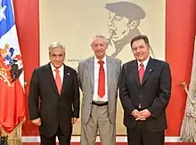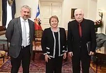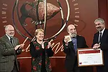 ![]() The Chilean Raúl Zurita receiving the award in 2016 from President Michelle Bachelet and minister Ernesto Ottone | |