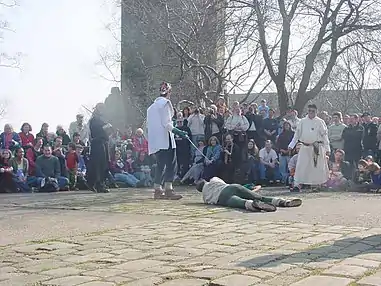 The bands of performers, called Pace Eggers, were locals who performed in their surrounding villages.[7] They often blacked their faces (as was common in English folk traditions such as Border Morris) and wore animal skins,[6] ribbons or coloured paper, masks, and sometimes wooden swords.[8]