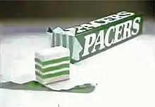 Originally known as Opal Mints,[2] they were plain white coloured chewy spearmint flavoured sweets, launched as a sister product to Opal Fruits (now known as Starburst). The product was subsequently relaunched as Pacers around 1976, and later, three green peppermint stripes were added to the sweet,[3] possibly to align it with a similar American product of the same name.[4] Television commercials for the sweet alluded to sport and fitness, with participants wearing green and white-striped kit, featuring the slogan "Peppermint striped for two-mint freshness".[4] The brand was discontinued in 1985.