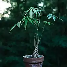 Pachira aquatica is a tropical wetland tree in the mallow family Malvaceae, native to Central and South America where it grows in swamps. It is known by its common names Malabar chestnut, French peanut, Guiana chestnut, Provision tree, Saba nut, Monguba (Brazil), Pumpo (Guatemala) and is commercially sold under the names Money tree and Money plant. This tree is sometimes sold with a braided trunk and is commonly grown as a houseplant, although more commonly what is sold as a "Pachira aquatica" houseplant is in fact a similar species, P. glabra.[2]