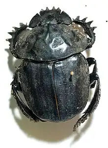 Pachylomera femoralis is a species of blackish gray dung beetle from the family Scarabaeidae,[2] which is widespread in the woodland and savannah regions of Africa south of the equator.