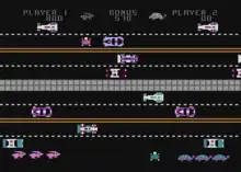 Pacific Coast Highway (stylized as Pacific Coast Hwy)[2] is a video game written by Ron Rosen for the Atari 8-bit family and published by Datasoft in 1982.[1] It is a clone of Frogger,[3] with the key gameplay differences being that Pacific Coast Highway allows two-player simultaneous play, and the road and water segments are split into separate, alternating, screens.[4]