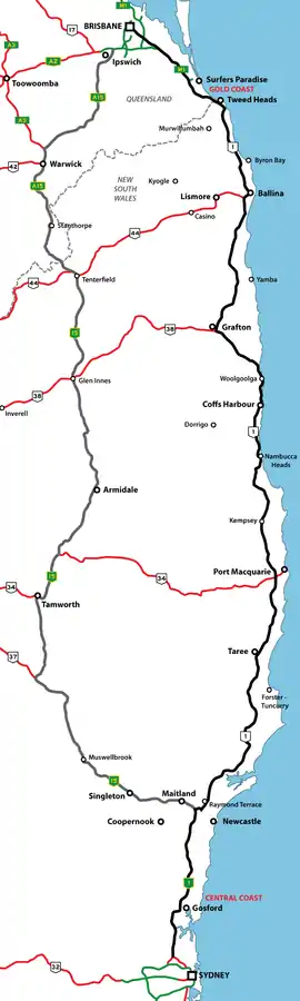 Pacific Highway is a 790-kilometre-long (491 mi)[1] national highway and major transport route along the central east coast of Australia, with the majority of it being part of Australia's Highway 1. The highway and its adjoining Pacific Motorway between Brisbane and Brunswick Heads and Pacific Motorway between Sydney and Newcastle links the state capitals of Sydney in New South Wales with Brisbane in Queensland, approximately paralleling the Tasman Sea and the Coral Sea of the South Pacific Ocean coast, via regional cities and towns like Gosford (Central Coast NSW), Newcastle, Taree, Port Macquarie, Kempsey, Coffs Harbour, Grafton, Ballina, Byron Bay, Tweed Heads and the Gold Coast, which is part of Queensland. Additionally, between Brunswick Heads and Port Macquarie (excepting for a short stretch around Coffs Harbour), the road is also signed as Pacific Motorway, but has not been legally gazetted as such.