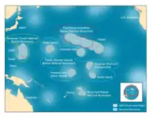 The Pacific Remote Islands Marine National Monument was proclaimed a national monument on January 6, 2009, by U.S. President George W. Bush[2][3] and follows his June 6, 2006, creation of the Papahānaumokuākea Marine National Monument in the Northwestern Hawaiian Islands. The original area was about 83,000 square miles (210,000 km2). It was expanded on September 25, 2014 by U.S. President Barack Obama. The monument covers 490,343 square miles (1,269,980 km2),[1] spanning areas to the far south and west of Hawaii: Baker Island, Howland Island, Jarvis Island, Johnston Atoll, Kingman Reef, Palmyra Atoll, and Wake Island. At Baker Island, Howland Island, Jarvis Island, Kingman Reef, and Palmyra Atoll, the terrestrial areas, reefs, and waters out to 12 nautical miles (22 km; 14 mi) (radius) are part of the National Wildlife Refuge System. For Baker Island, Howland Island, Kingman Reef, and Palmyra Atoll, fishery-related activities seaward from the 12 nmi (22 km) refuge boundaries out to the 50 nmi (93 km) MNM boundary (about 100 nmi (190 km) square across) are managed by NOAA. For Jarvis Island, Johnston Atoll, and Wake Island, fishery-related activities seaward from the 12 nmi (22 km) refuge boundaries out to the 200 nmi (370 km) MNM boundary (U.S. EEZ waters) are managed by NOAA. The land areas at Wake and Johnston Atolls remain under the jurisdiction of the U.S. Air Force, but the waters from 0 to 12 nmi (22 km) are protected as units of the National Wildlife Refuge System. The entire monument is closed to commercial fishing and other resource extraction activities, such as deep sea mining.[5]