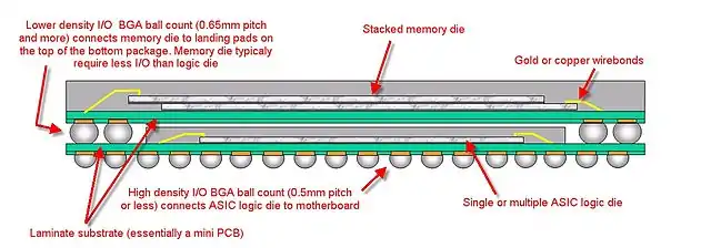 • Mixed logic-memory stacking: logic (CPU) package on the bottom, memory package on top. For example, the bottom could be a system on a chip (SoC) for a mobile phone. The logic package is on the bottom because it needs many more BGA connections to the motherboard.