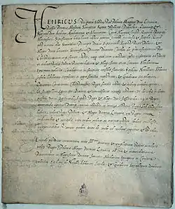 The document was drawn up by the convocation sejm.[3] The pacta conventa affirmed the king-elect's pledge to respect the laws of the Commonwealth and specified his undertakings and promises in such realms as foreign policy, taxes, public debt, the military, and so on.[2] They varied from king to king, depending on whatever particular pledges he might have made.[2] An example of the various concrete undertakings found in a king-elect's pacta conventa is King Władysław IV Vasa's pledge to create a Polish–Lithuanian Commonwealth Navy for the Baltic Sea.