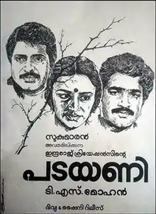 Padayani is a 1986 Indian Malayalam-language thriller film written and directed by T. S. Mohan and produced by Sukumaran. It stars Mammootty, Mohanlal, Shobhana and Devan. The film features music composed by A. T. Ummer.[1][2] Ramesh, Sudhakaran and Rajasekharan are long-lost friends, who reunite to take revenge against the evildoer in their lives. The film was the debut of Indrajith Sukumaran, who plays the younger version of Ramesh (Mohanlal).