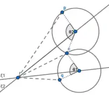 Illustration of Paden–Kahan Subproblem 2. The subproblem yields two solutions in the event that the circles intersect at two points; one solution if the circles are tangential; and no solution if the circles fail to intersect.