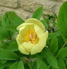Paeonia daurica subsp. mlokosewitschii, the golden peony or Caucasian peony, is a species of flowering plant native to the Caucasus Mountains in Azerbaijan, Georgia, and Dagestan, where it grows on rocky slopes in oak, hornbeam, or beech forests. The plant is sometimes nicknamed Molly the witch, a humorous mispronunciation of the species name, which most people find difficult to pronounce.[2] It was formerly regarded as a separate species, Paeonia mlokosewitschii, but in 2002, the Chinese botanist Hong Deyuan reduced it to a subspecies of Paeonia daurica.