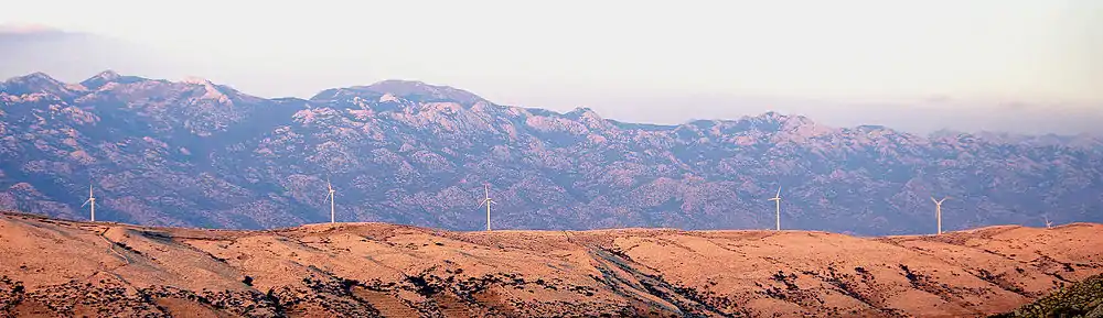 The first Croatian wind farm was constructed on Pag island, just northeast of Pag town. The 5.95 MW "Vjetroelektrana Ravna 1" wind farm is composed of seven Vestas V52 wind turbines and has operated since 2004.[5]