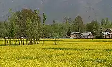 Pahalgam (Hindustani pronunciation: [pɛhɛlɡaːm]), known as Pahalgom (Kashmiri pronunciation: [pəhəlʲɡoːm]; lit. 'village of shepherds' in Kashmiri)[3] is a town and a notified area committee, near Anantnag city in the Anantnag district of the Indian-administered union territory of Jammu and Kashmir.[4][5][6][7][8] It is a popular tourist destination and hill station. Its lush green meadows and pristine waters attract thousands of tourists from all over the world each year.[9] It is located 45 kilometres (28 mi) from Anantnag on the banks of Lidder River at an altitude of 7,200 feet (2,200 m). Pahalgam is the headquarters of one of the eleven tehsils of Anantnag district.
