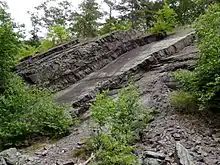 The copper ore deposit found here is the grayish mineral chalcocite (copper sulfide) embedded in a hard gray sandstone band of the Bloomsburg Red Beds.[7] The similar color and low ore yield make visual identification difficult. Secondary minerals that can be seen include green malachite and blue-green chrysocolla.[7] Between 1903 and 1906, Dr. Keith reported an average yield of 3.25% copper using 100 samples. In 1943, the United States Geological Survey reported yields of 0.11% to 0.38% copper and recommended that no more work be done at Pahaquarry.[20]