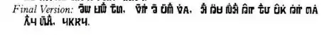 - The final version, Pahawh Tsa (Pajhawj Txha) "core version", published in 1971 just a month before Shong's death, was a radical simplification with one letter per rime and one diacritic per tone. The onsets were not changed. The only graphic addition was that of three new tone marks, for seven total, but half of the rimes were eliminated: The -b, -m, -d, -j tones are written as in stage 3; the -v, -, -s, -g tones now use the same rime letters as the other tones but with different diacritics: circumflex, underlined dot, underlined stroke, and diaeresis. (The diaeresis is retained from stage 3, so only the rime letter changes for this tone.) Stage 4 is not widely known, but is used as a kind of shorthand by some who do know it; indeed, it may be called "Hmong shorthand" in English.