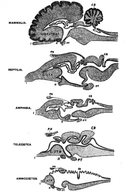 All vertebrate species have a common brain archetype divided into the telencephalon and diencephalon (collectively referred to as forebrain), mesencephalon (midbrain) and rhombencephalon (hindbrain).[39] Nervous connections to the telencephalon indicate that frogs may be able to perceive pain.[25]