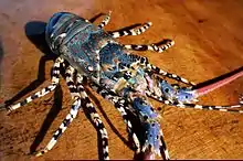 Panulirus ornatus (known by a number of common names, including tropical rock lobster,[3][4] ornate rock lobster,[5] ornate spiny lobster[2] and ornate tropical rock lobster[6]) is a large edible spiny lobster with 11 larval stages that has been successfully bred in captivity.[7]