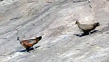 The painted spurfowl (Galloperdix lunulata) is a bird of the pheasant family found in rocky hill and scrub forests mainly in peninsular India. Males are more brightly coloured and spotted boldly in white. Males have two to four spurs while females can have one or two of the spurs on their tarsus. The species is found mainly in rocky and scrub forest habitats unlike the red spurfowl. It is found in the undergrowth in pairs or small groups, escaping by running and rarely taking to the wing when flushed.
