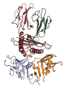 Paired receptors are pairs or clusters of receptor proteins that bind to extracellular ligands but have opposing activating and inhibitory signaling effects.[2][3][4] Traditionally, paired receptors are defined as homologous pairs with similar extracellular domains and different cytoplasmic regions, whose genes are located together in the genome as part of the same gene cluster and which evolved through gene duplication.[3][5] Homologous paired receptors often, but not always, have a shared ligand in common.[5][6] More broadly, pairs of receptors have been identified that exhibit paired functional behavior - responding to a shared ligand with opposing intracellular signals - but are not closely homologous or co-located in the genome.[4] Paired receptors are highly expressed in the cells of the immune system, especially natural killer (NK) and myeloid cells, and are involved in immune regulation.[5][7]
