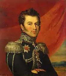 From 19 June 1812 to 20 August, he was the chief of the Sevastopol Infantry Regiment, and then became adjutant to General Mikhail Kutuzov, at whose side he remained in the Battle of Borodino.[4] From October, he commanded the vanguard of Matvei Platov's Don Cossacks Corps. On 14 March 1813 he was promoted to major general, with seniority dating to 7 September. In the War of the Sixth Coalition, he headed a cavalry detachment, which took part in the Battle of Hanau and the Battle of Arcis-sur-Aube.[5]