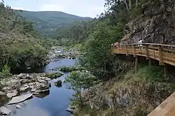 One of the main crossing points of this watercourse is the municipality of Arouca, where the Passadiços do Paiva were built, an hour away from Porto, which allow, for a moment, to leave the reality of the urban space of the city and enter a scenario out of a film,[2] being a wooden walkway of about 8.7 kilometers, with the construction of an additional 12 kilometers,[3] located in the parish of Canelas e Espiunca, in the municipality[4] of Arouca[5] built along the left bank of the Paiva River, in the hydrographic basin of the Douro River,[6] between the bridge of Espiunca and the river beach of Areinho, thus encompassing the area known as the "Garganta do Paiva", being one of the main elements of the Arouca Geopark.