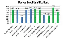 Pakistani applicants to universities are over-represented by 7.5% from Greater London.[3] In education, Pakistanis in London performed the highest out of all British Pakistanis in the 2001 census. This is not just reflected in above average GCSE pass rates but also in degree level qualifications, with 32% of London Pakistanis having degree level or higher qualifications. This is marginally higher than the London average of 31% and is more than twice as high as the figure for London Bangladeshis (15%), equal to the figure for "Other Asians" and comparable to the figure of 34% for London Indians. Pakistanis in Inner London do slightly better than those in Outer London, with 33% reaching the benchmark compared to 32% in Outer London. The figure is higher than the national average of 20% and almost twice as high as the figure for Pakistanis throughout the UK (18%).