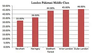 Between 1991 and 2001, out of the total growth in the London Pakistani population, 52.7% of the growth was in the middle classes.[8]