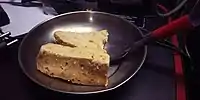 Chikki is a ready-to-eat solid, brittle sweet generally made from casting a mix of dry nuts and hot jaggery syrup. Peanuts and jaggery mix are most common.[27] Other than almonds, cashews, walnuts, sesame and other seeds, varieties of chikki are also prepared from puffed or roasted Bengal gram, puffed rice, beaten rice, puffed seasonal grains, and regional produce such as Khobara (desiccated coconut). Like many Indian sweets, Chikki is typically a high protein delicacy.[28]