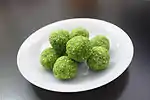 Rasgulla is a popular sweet in the Indian subcontinent. It comes in many forms, such as Kamalabhog (orange rasgulla), Rajbhog (stuffed with dry fruits and khoya inside), Kadamba (often served with kheer), and Rasamundi, Raskadamba.[41] Some are white in color while others are cream, brown, gold or orange. They are called Rasbari in Nepal. This dish is made by boiling small dumplings made of a mixture of chhenna and semolina in sugar syrup. Once cooked, these are stored in the syrup, making them spongy. Increasing the semolina content reduces the sponginess of the dessert and hardens them, creating a variety of textures. Some Rasgulla are stuffed inside with treats, such as dry fruits, raisins, candied peel, and other delicacies to create a variety of flavors. Some versions, called danedhar, are removed from the syrup and sugar-coated into different fruit shapes and other creative designs.[42] These are festive foods found year-round in many parts of India.