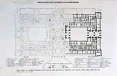 In November 1794, during the reign of Queen Mary I and the Prince-Regent, the royal tent was destroyed by fire, although the fire-fighters were able to save the library and church.[3] A more permanent dwelling was conceived by the architect José da Costa e Silva. Starting on 17 July 1795 the rubble and terrain was cleared, which continued on 27 July under the direction of António Vicente. The first cornerstone was laid on 9 November under the direction of Manuel Caetano de Sousa (with a secondary project under the supervision of German Xavier de Magalhães).[3] It was conceived as a Baroque-late Rococo building, but the construction was interrupted shortly after. As of 19 May 1796 the project was supplied by the masons Francisco António and Joaquim Baptista, who brought in stone from Monsanto (Idanha-a-Nova), sand from Alfeite, calcium oxide cooked in Alcântara, tile from the Alhandra, with limestone provided from Pêro Pinheiro, Belas, Vila Chã and Monsanto. The intervention of many architects resulted in a royal decree (9 December 1801) that stated that alterations to the project could only be made in agreement with Manuel Caetano de Sousa, Joaquim de Oliveira, José da Costa e Silva and/or Francisco Xavier Fabri (as long as it economized on the project costs). But, Manuel Caetano de Sousa designed an overcomplicated and intricate Baroque building (which was later criticized by Costa e Silva and Fabri in 1801). But, with mounting confusion and difficulties between the architects and contractors, on 21 January 1802, José da Costa e Silva and Fabri were invited by the Crown to present a new project, in conjunction with António Francisco Rosa and Manuel Joaquim de Sousa, while excluding Manuel Caetano de Sousa.