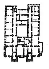 The palace plan and architectural solution differs by industrialist tones: enfilade of the rooms are completed with hall chambers, the windows are facing the front facade. All rooms, including "Black" stairs and toilets, are lit up when air does. The exact system of capital walls is represented by one layered construction and constitutes basis of the carcass, which is connected to extensive corridors. The main stairs cover the north-western part of the quadratic yard area. At the end, the service (black) stairs are located. The left portico has access to the corridor. A three-quarter turn, triumphant marble staircase rises up from the right to the second floor, and discloses an interior. From the entrance, there is a marble two-quarter turn, an indoor-looking corner staircase. Both stairs combine the corridor in the style of enfilade.[5] Palace of De Boure is considered one of the best objects in Baku with its architectural-plan and effectiveness.[8]