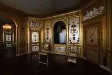 The boudoir next to the Queen's bedroom was created for Queen Marie-Antoinette in 1786, and permitted the Queen to have a measure of privacy. The room is the best surviving example of the decorative style just before the French Revolution, inspired by ancient Roman models, with delicately painted arabesques, cameos, vases, antique figures and garlands of flowers against a silver background, framed by gilded and sculpted woodwork.[28]