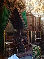 The walls received their ornamental textile covering, with a design of flowers and birds, in 1805. It was restored in 1968–1986 using the original fabric as a model. The furniture in the room all dates to the First Empire. The balustrade around the bed was originally made for the throne room of the Tuileries Palace in 1804. The armchairs with a sphinx pattern, the consoles and screen and the two chests of drawers were placed in the room in 1806.[27]