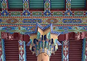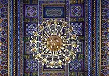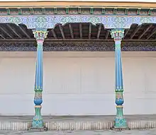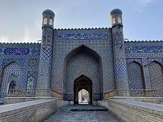 The Palace of Khudayar Khan, also known as Kokand Urda, was built in the early 1870s. It was the last in a series of seven palaces, each grander than the last, and it was intended to project the power of the khan.[1] The architect was Mir Ubaydullo, and the palace is said to have been built by 80 master builders and 16,000 conscripted labourers.[2] The American diplomat Eugene Schuyler described the palace as being "much larger and more magnificent than any other in Central Asia... glittering in all the brightness of its fresh tiles, blue, yellow and green[3]."