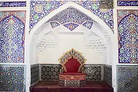 The entire facade is richly tiled, with a mixture of geometric patterns and inscriptions. Above the gateway, an Arabic inscription reads “High Palace of Seid Muhammad Khudayar Khan”.[2] The use of yellow and green in the colour scheme makes this building distinct (and dates it later) than the mostly blue and turquoise monuments found elsewhere in Uzbekistan.