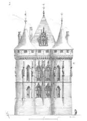 The tour Maubergeon was reconstructed on three floors with ogival vaulting, illuminated by glazed windows and topped by nineteen statues. Of these, only sixteen pieces survive: they represent the duke's counsellors in clerical habits, while the statues of the duke and his wife are missing. In its unfinished state, the tower has neither machicolations nor canopies above the statues.