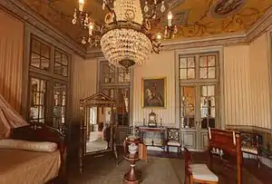 This was one of the private rooms used by Maria I during her time at Queluz. It is designed in the form of a bower, with a trellis pattern on the ceiling, which is reflected in the design of the marquetry floor, giving the impression of being in a pergola rather than an interior.[14] The marquetry floors of the private rooms distinguish these smaller, more intimate, rooms from the larger state rooms where such delicate features would have been damaged by more frequent use. The walls of the boudoir are heavily mirrored and contain overdoor and mirror cartouches by José Conrado Rosa.[25] Next to the boudoir is the Queen's bedroom; it was from this light and airy room that the shrieks of the mentally ill Queen were reported by William Beckford, while visiting the palace in 1794.[26]