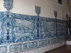 The interior is distinguished for its 18th-century azulejo panels representing gallant scenes, flanked by accented tiles forming divisions as pilasters and surmounted by vases.[2] A marble staircase, covered in vaulted ceiling includes decoration in relief stuccos. Similarly, there are two other triangular azulejo panels depicting Saint Francis of Assisi and Saint Martial.[2]