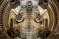 The lobby features a central hall adorned with inscriptions in Latin verse and monster statues. It radiates out from a central dome into nine vaulted archways; these represent the nine circles of hell as described the Inferno. The first three floors have geometric figures representing the alchemical symbols for fire, the colors of the Italian flag, and various Masonic symbols on the walls and floors. The lobby also has operational antiquated elevators.[4]