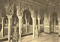The Palace, a small imitation of the Alhambra in Granada, was built by Catalan businessman Jose Xifré Downing between 1862 and 1865. Josep Xifré Downing was heir to a large fortune thanks to his Catalan father, Josep Xifré i Casas, who owned multiple businesses in Cuba, the US and Europe. The son met the architect José Contreras who was then the restorer of the Alhambra. Contreras, was a pioneer of Neo-al-Andalusian architecture and before starting the construction of the Palace, he received a six-month scholarship from Xifré to study the incorporation of the decorations of the Alhambra in his future Palace. In 1857, the financier bought nine sites located between Calle Lope de Vega and Trajineros (current Paseo del Prado) to the Duke of Medinaceli. The area had begun installing the elite members of Madrid. The construction works discoursed between 1858 and 1862.[1]