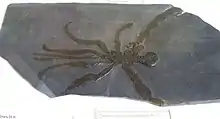 Medial to the anterodorsal margin of cephalon was an eye-bearing ocular tubercle. Unlike the paired 4-eyed arrangement of most pycnogonids, it compose of a pair of large eyes and 2 smaller eyes that arranged anteroposteriorly in a midline.[1] The anteriormost appendages were a pair of robust, pincer-like chelifores, which compose of 5 podomeres (3 for scape and 2 for pincer) instead of 3 or 4 (1 or 2 for scape and 2 for pincer) like those of the other pycnogonids.[3] Below the chelifores was a cylinderal proboscis that always tucked underneath the cephalon, making it almost invisible in dorsal view.[1] The palps and ovigers have similar morphology, the former terminated with a subchelate structures and the latter was apparently absent in some specimens, which may represent sexual dimorphism as seen in some modern pycnogonid taxa[1] such as Pycnogonidae and Phoxichilidiidae (female lacking ovigers).[4][5] Each of the leg base was surrounded by flexible, ring-like structure.[1] Among the 4 leg pairs the first one is significantly elongated, and its detail morphology slightly differ from the posterior counterparts as well (e.g. shorter basal segments, different setae arrangement, 4 flatten distal podomeres instead of 5).[1]