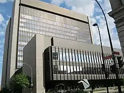 Though located in the Old Montreal historic district, it is an international style structure, featuring the outdoor sculpture Allegrocube. The black metal and granite building is adjacent to the Champ de Mars square. It was designed by Montreal architects Pierre Boulva and Jacques David, whose other prominent Montreal projects included 500 Place D'Armes, Théâtre Maisonneuve, the Dow Planetarium and the Place-des-Arts, Atwater and Lucien-L'Allier metro stations.[3][4]