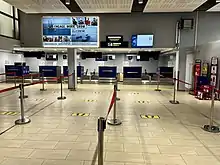 Two adjacent terminals connected by short walkways and a transit area serve the airport: