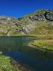 Situated at the bottom of a grassy hollow, enclosed by high rock walls, the lake is a deep basin of rather large dimensions. The latter is further accentuated by the steepness of the depression.[23]