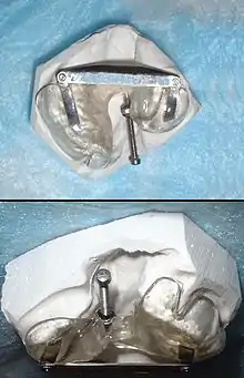 A palatal plate is a prosthetic device, generally consisting of an acrylic plate and retention clasps of orthodontic wire, which covers a fistula of the palate. It may be used to aid in improving articulation and feeding. The blockage of the opening helps improve hypernasality and suckling ability for babies. In the case of a labial-oral-nasal fistula, the plate may include an anterior upward extension to fully occlude the passageway running between the labial surface of the alveolus, alveolus, and nasal cavity. The plate may be constructed to include any congenitally missing teeth to improve articulation and appearance. Individuals who use palatal plates must be monitored periodically by their dental professionals due to possible tissue irritation by the plate. Materials such as food particles, oral mucosa and secretions may cause buildup on the upper surface of the plate; therefore, it is essential to clean a palatal obturator at least twice a day to avoid tissue irritation. There are also more specific terms used for obturators depending on their time and purpose of use: Photo Examples of the Latham Device or the Nasal Alveolar are prime examples for use in Cleft Palate Deformities.