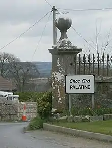 Palatine (Irish: Na Cnoic Arda)[1][2] is a village in County Carlow, Ireland. It lies mostly within the townlands of Knockarda and Killyshane, close to the County Kildare border. Its unusual English name bears no relation to its original Irish name, Na Cnoic Arda, which roughly translates as 'high hills'.