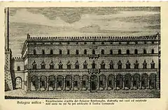 The palace of the noble Bolognese family of Bentivoglio was built on the orders of Sante Bentivoglio, in Via San Donato (today Via Zamboni), starting in 1460, and was subsequently completed by Giovanni II Bentivoglio. Contemporary chroniclers and scholars have attempted to reconstruct the appearance of the great house on the basis of often enthusiastic descriptions. The main facade facing onto Via San Donato measured 30 meters, while the sides were over 140 meters in length. Located on the ground floor were the apartments of the men of the house of Bentivoglio, while the upper floor held the apartment of Giovanni II, richly frescoed, and the equally sumptuous apartment of Ginevra Sforza and the other women of the house. The building also housed guards and soldiers and included guest rooms, warehouses and depots of arms. The building had 244 rooms in total. In it, the Bentivoglio received illustrious visitors and friends, and gave sumptuous dinners and parties.[1]