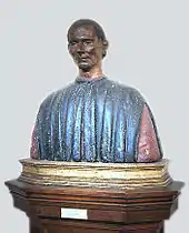 This was Machiavelli's office when he was Secretary of the Republic. His polychrome bust in terracotta and his portrait are by Santi di Tito. They are probably modelled on his death mask.